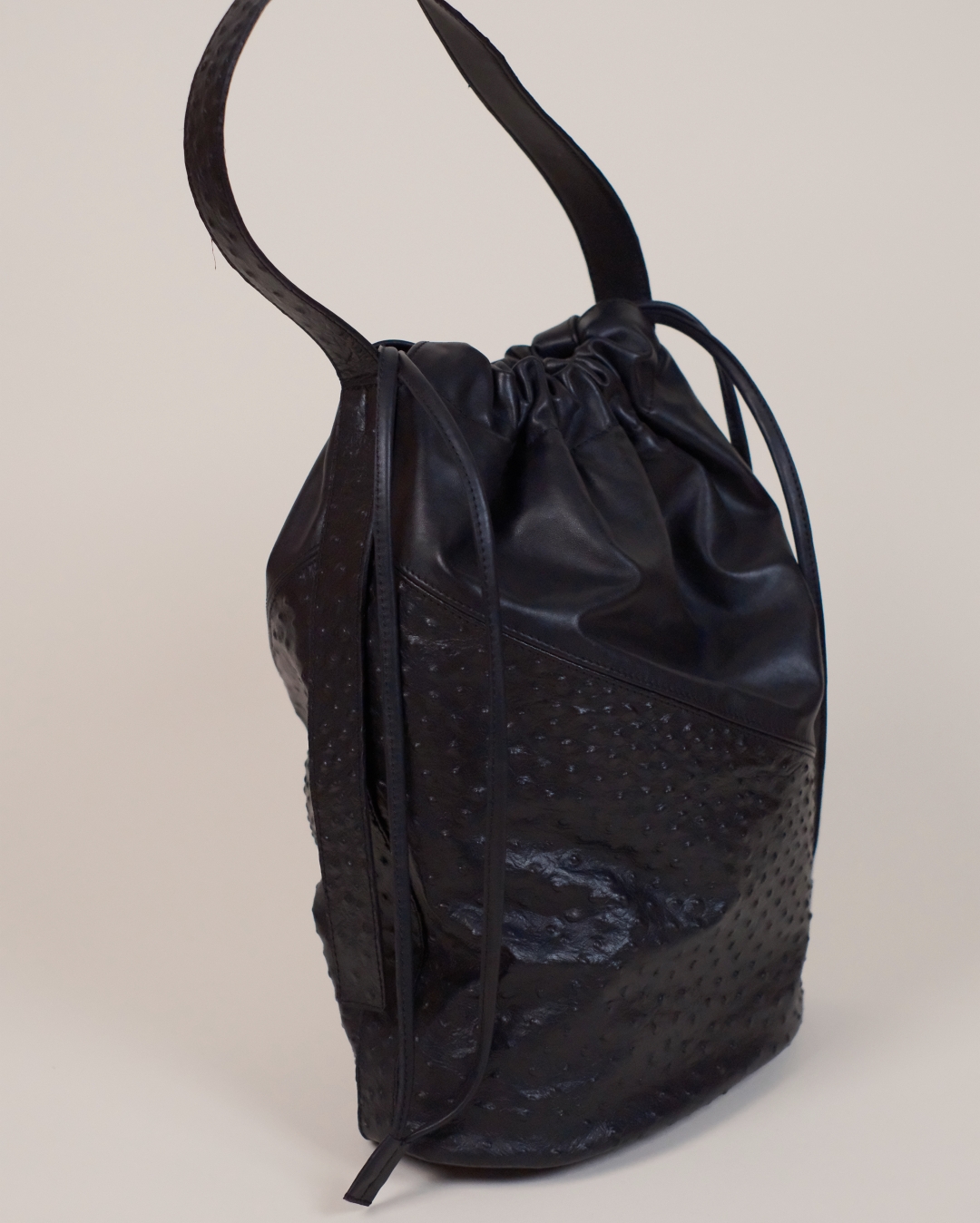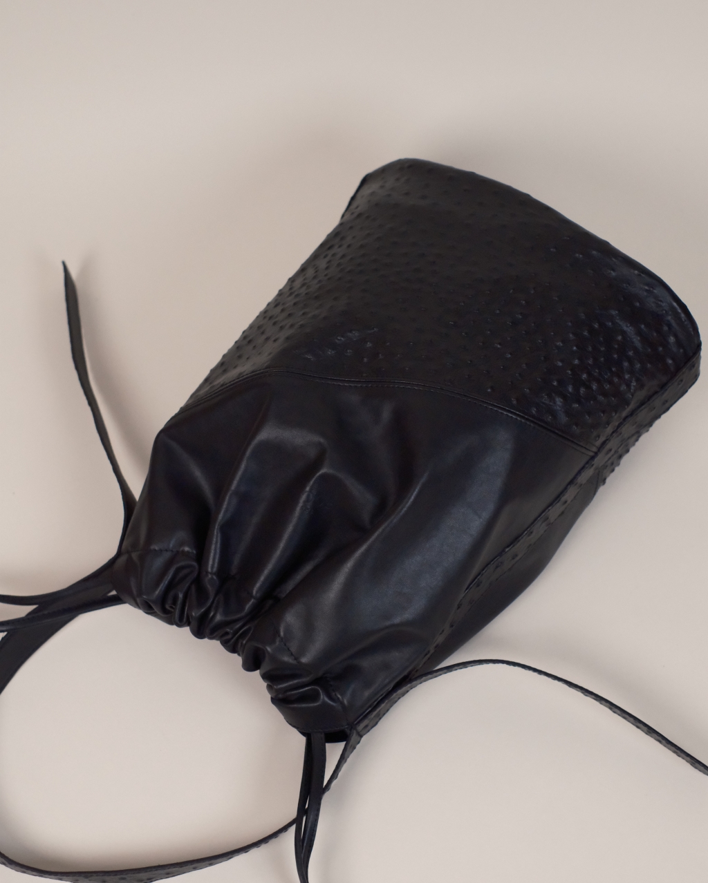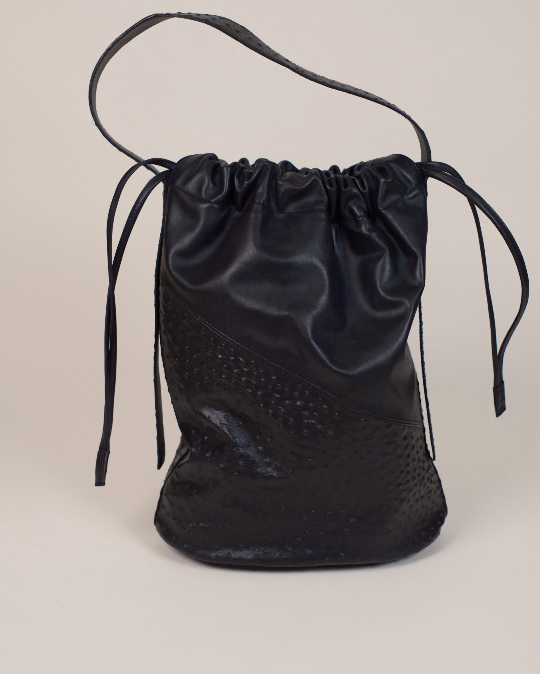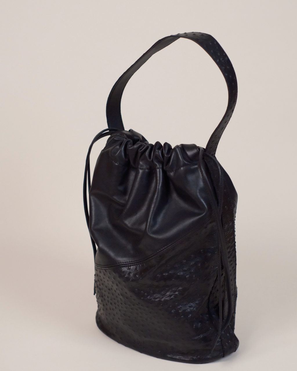 Delikatnie strukturalna torebka damska do ręki i na ramię, wykonana z połączenia gładkiej skóry nappa i tłoczonej skóry typu struś. Pionowy szew podkreśla rzeźbiarską formę. Zamykana na skórzane troki, wewnątrz główna kieszeń oraz praktyczna mini bag / kopertówka, którą można używać osobno lub jako organizer.
