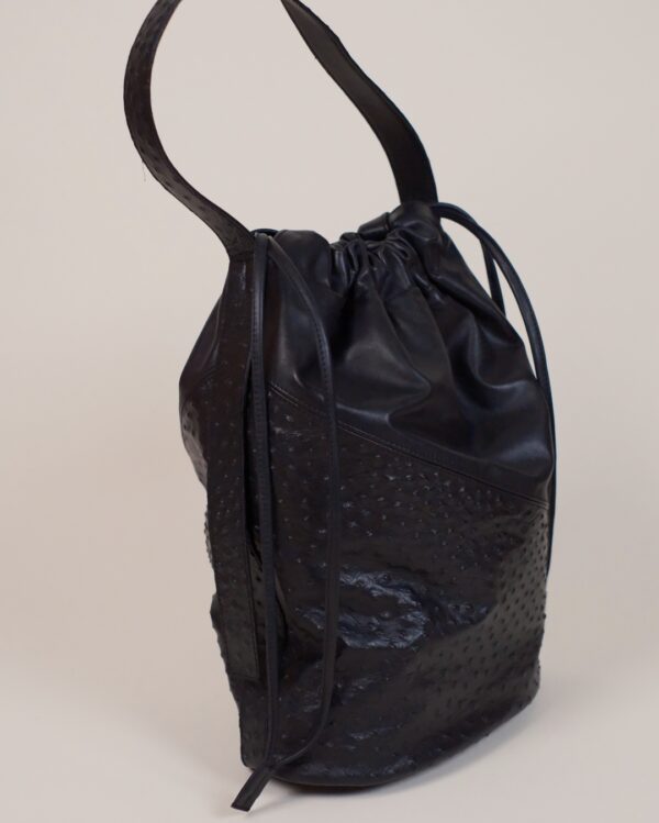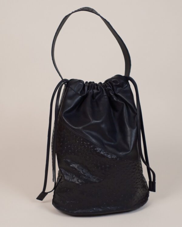 Czarna skórzana torebka DUA Struś – minimalistyczna, ręcznie wykonana w Polsce, do ręki i na ramię. Wykonana z włoskiej skóry licowej i tłoczonej skóry typu struś. Zawiera praktyczną mini bag / kopertówkę.