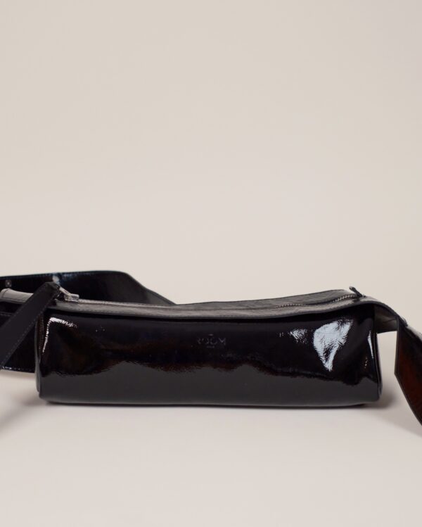 TUBA – Black LAK – minimalistyczna, ręcznie wykonana w Polsce torebka crossbody z włoskiej skóry lakierowanej typu crash, z regulowanym paskiem i wewnętrzną kieszenią na karty i drobiazgi.