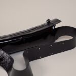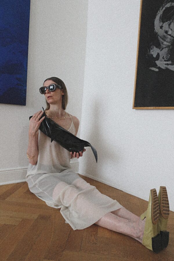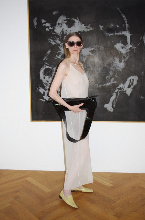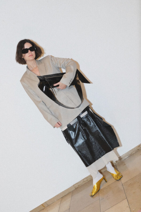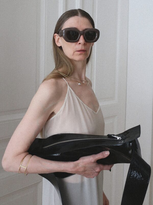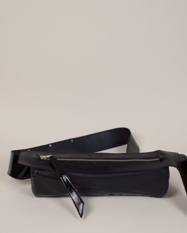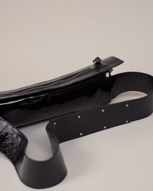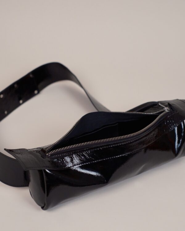 Minimalistyczna, czarna torebka crossbody w kształcie tuby, wykonana z certyfikowanej włoskiej skóry lakierowanej typu crash. Charakterystyczne marszczenie skóry nadaje modelowi rzeźbiarski, wyrazisty charakter, łącząc geometryczną formę z nowoczesnym, minimalistycznym designem.