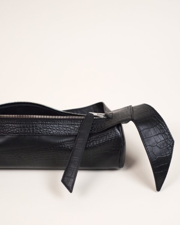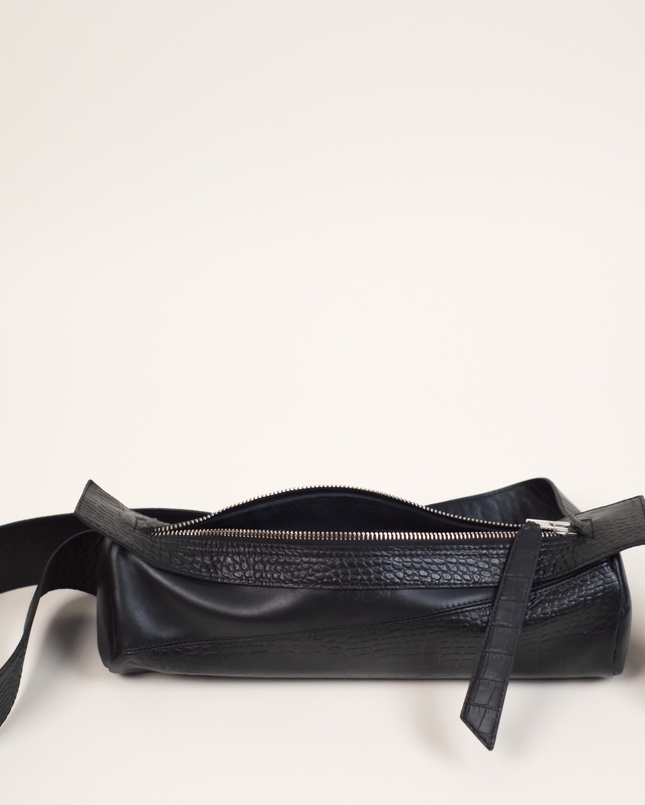 Delikatnie strukturalna torebka crossbody w kształcie tuby, wykonana z połączenia włoskiej skóry licowej i skóry z tłoczeniem croco. Pionowy szew podkreśla rzeźbiarską formę. Wersja Compact oferuje bardziej zwarte proporcje, zapewniając lekkość wizualną i komfort noszenia.