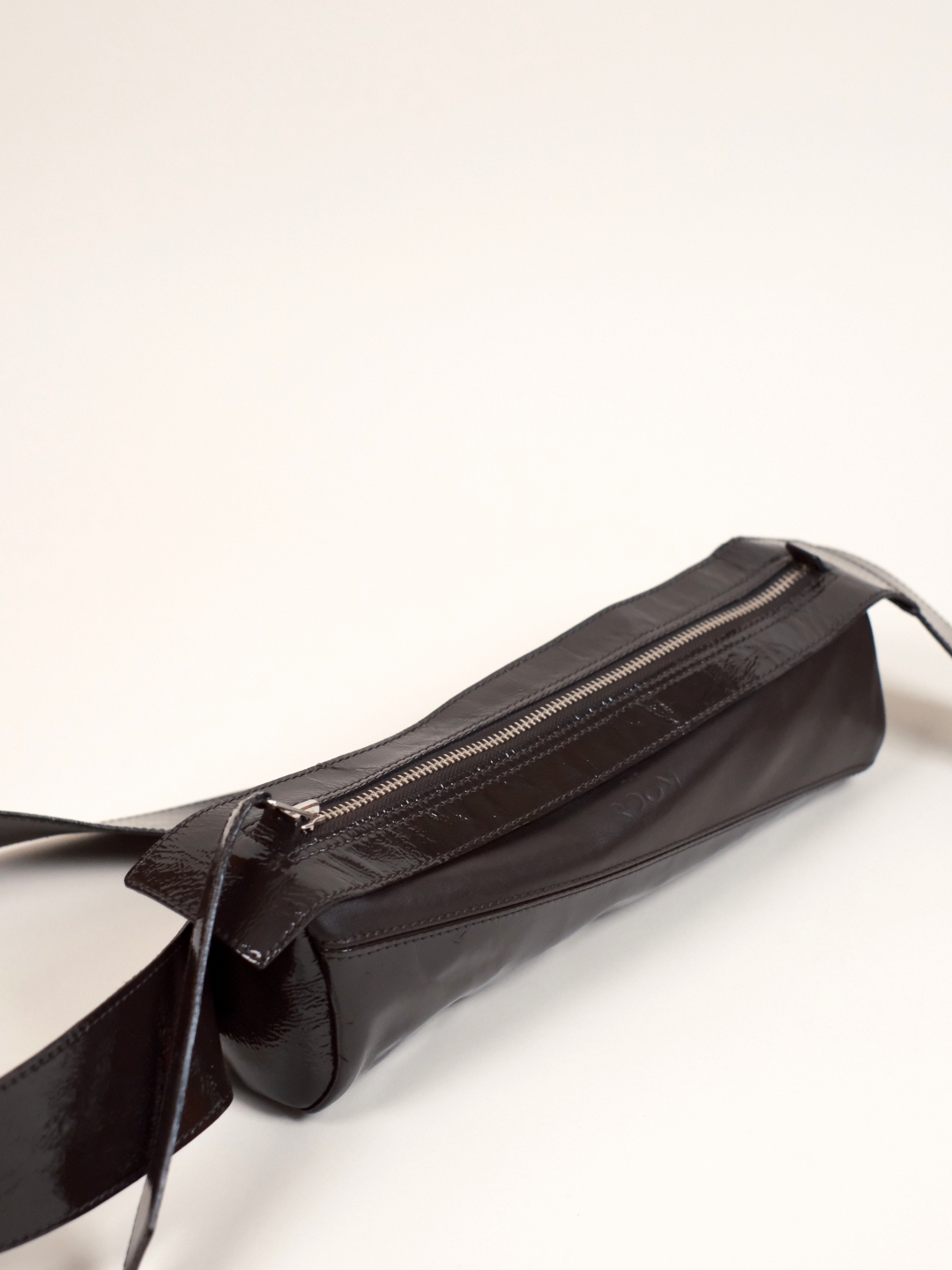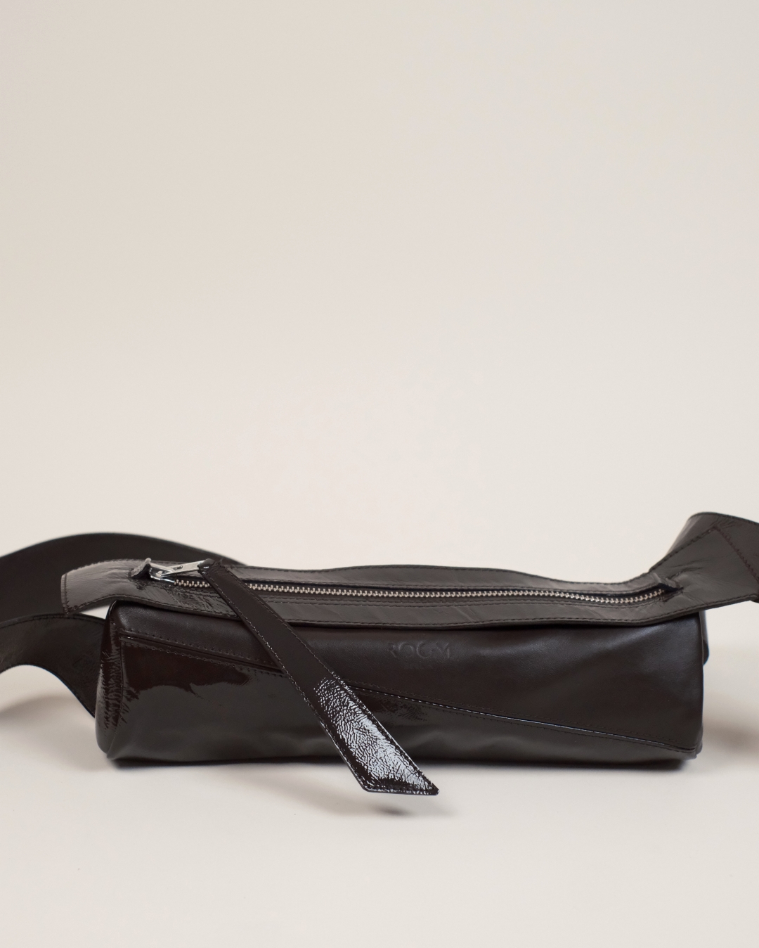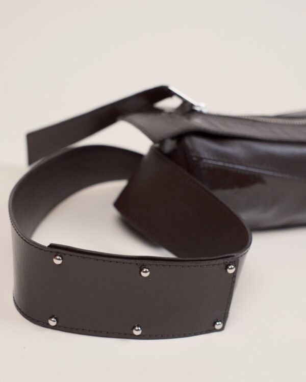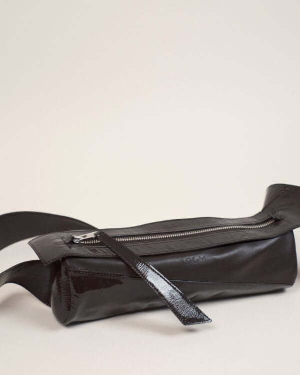 Delikatnie strukturalna, czarna (głęboka mokka) torebka crossbody w kształcie tuby, wykonana z połączenia certyfikowanej włoskiej skóry licowej i lakierowanej, marszczonej skóry typu crash. Pionowy szew podkreśla rzeźbiarską formę. Wersja Compact oferuje zwarte proporcje, zapewniając lekkość wizualną i komfort noszenia.