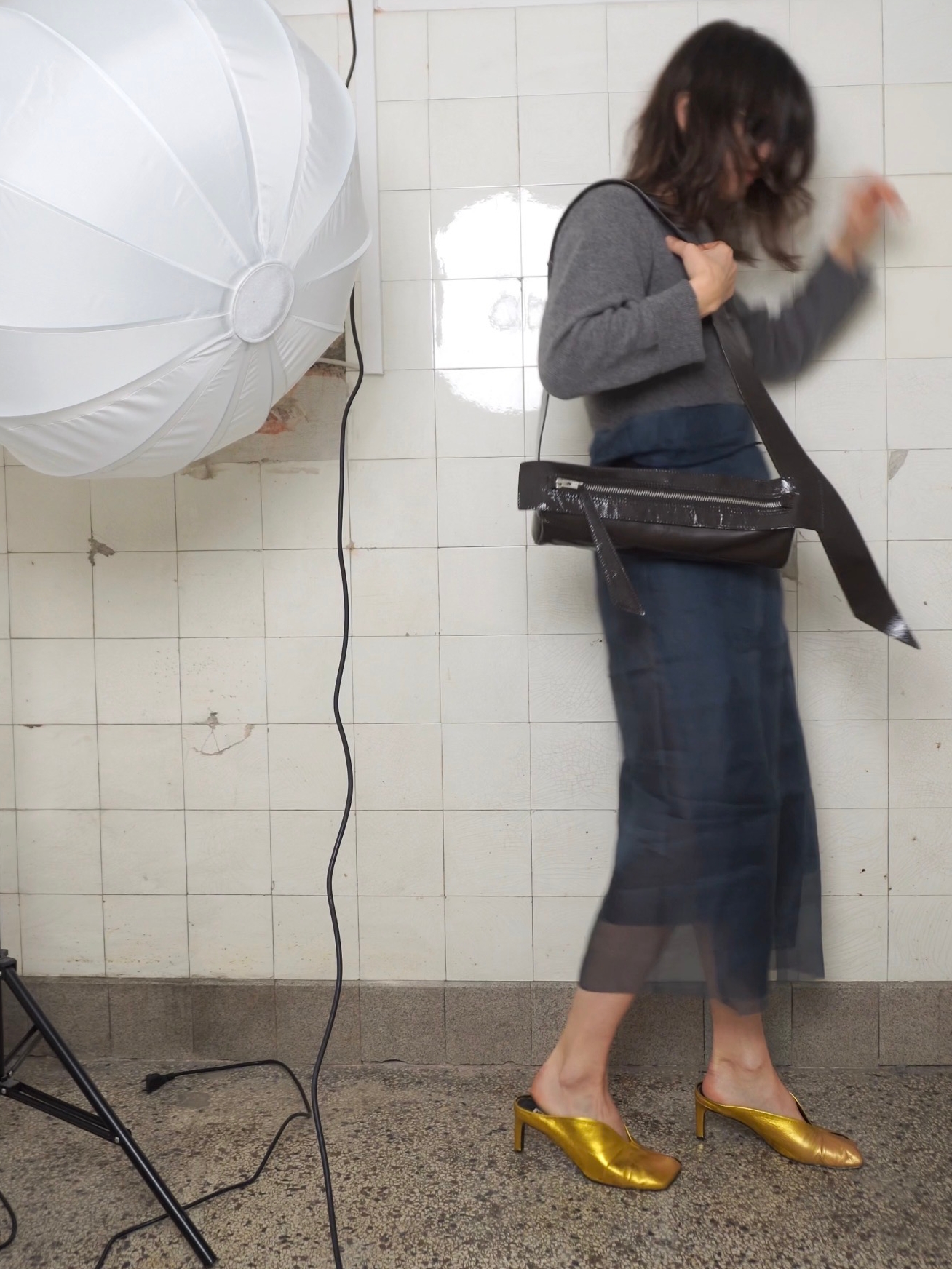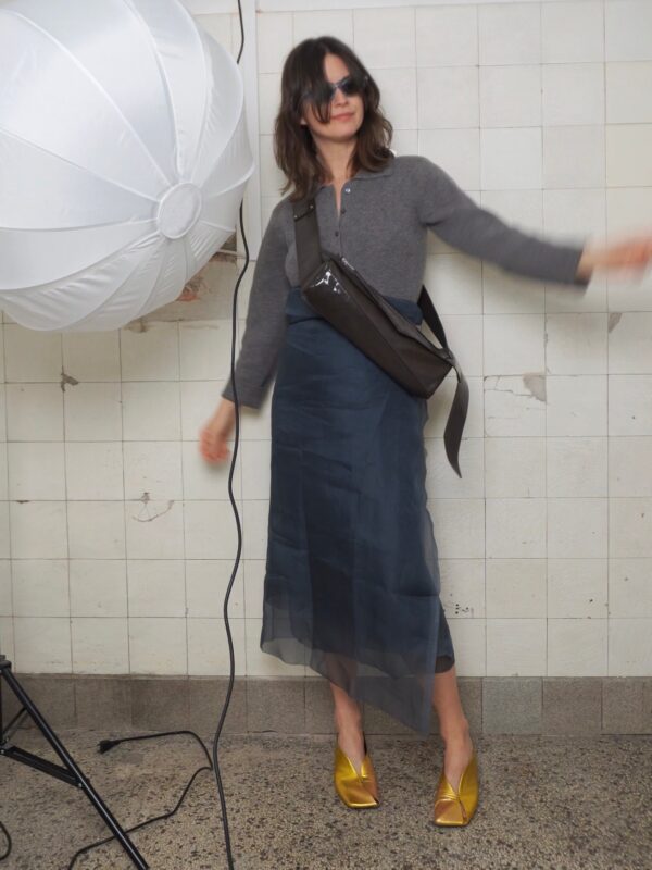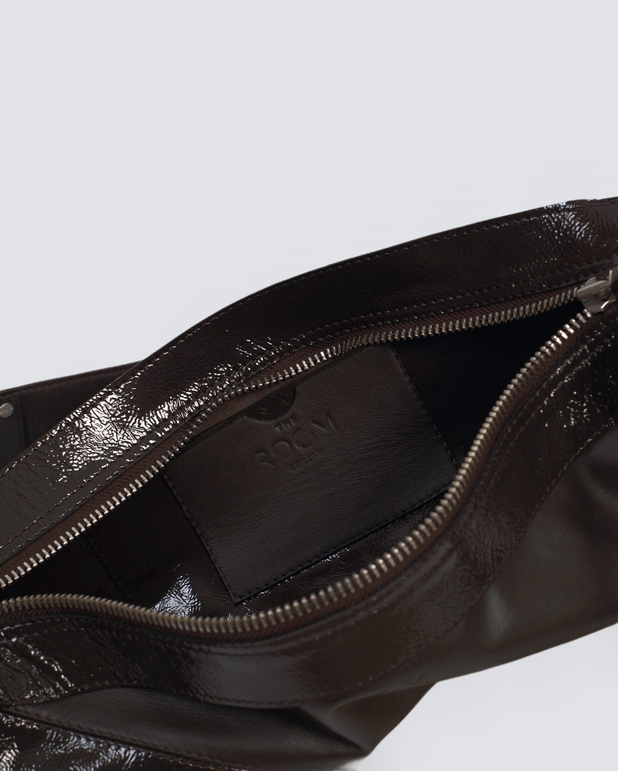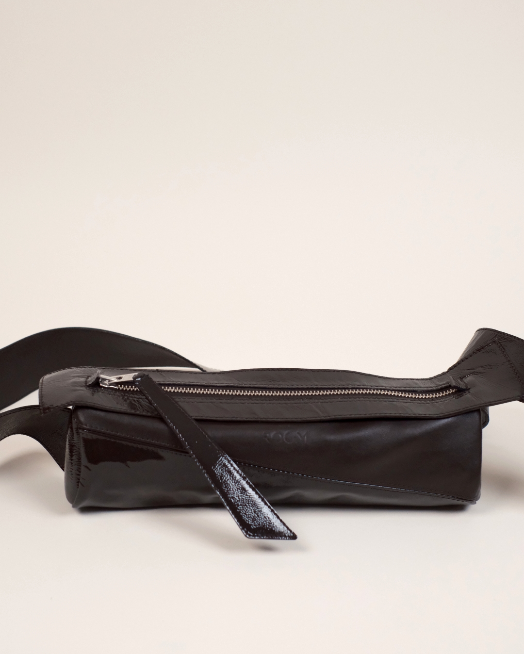 Delikatnie strukturalna, czarna (głęboka mokka) torebka crossbody w kształcie tuby, wykonana z połączenia certyfikowanej włoskiej skóry licowej i lakierowanej, marszczonej skóry typu crash. Pionowy szew podkreśla rzeźbiarską formę. Wersja Compact oferuje zwarte proporcje, zapewniając lekkość wizualną i komfort noszenia.